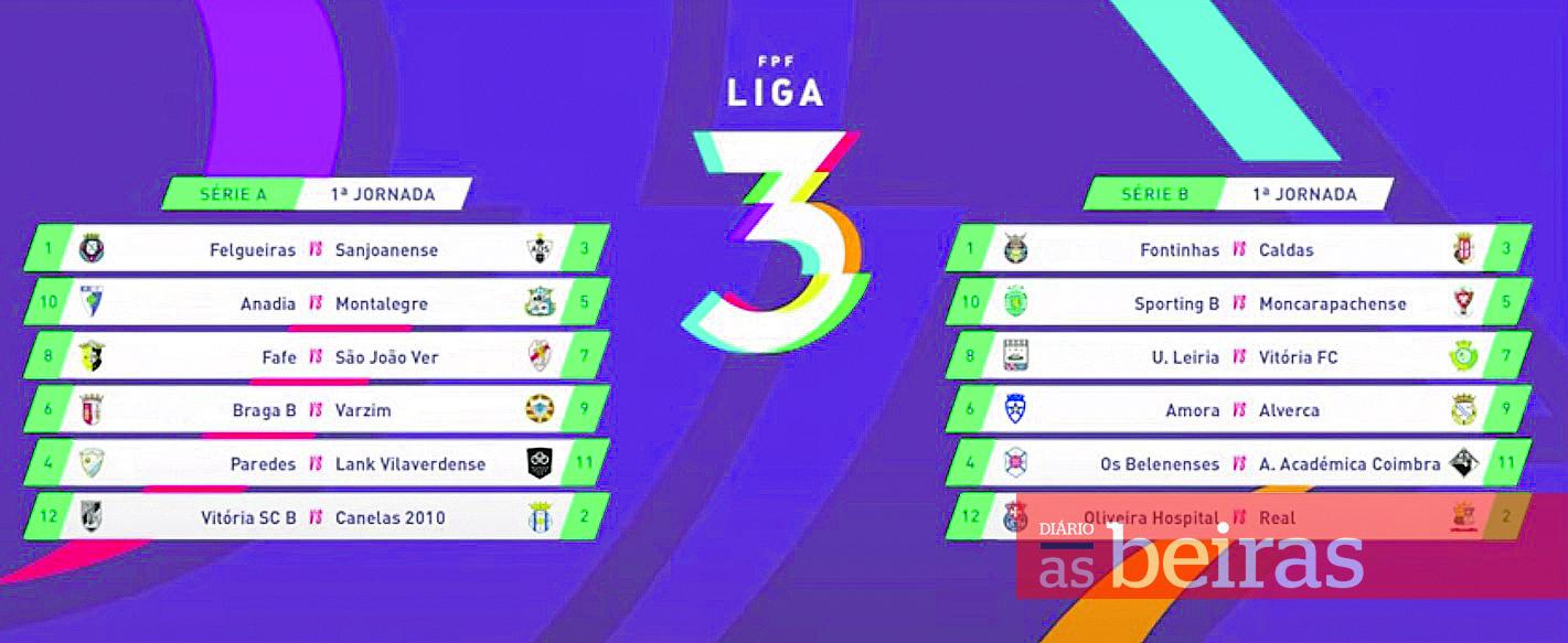 A competição começa no fim de semana de 20 e 21 de agosto (os horários dos jogos ainda não estão definidos) e se os estudantes, em estreia no terceiro escalão do futebol português, jogam em Belém, o O. Hospital arranca a época em “casa” diante do Real SC. O conjunto oliveirense, que avança para a segunda temporada na Liga 3, deve voltar a utilizar o Estádio Municipal de Tábua para os jogos na condição de visitado. Em relação à Briosa, ainda não está definido qual o reduto que será utilizado nos primeiros duelos em casa. Ainda na 1.ª jornada da série B, nota para mais um duelo de “históricos” do futebol nacional, com a U. Leiria a receber o V. Setúbal.