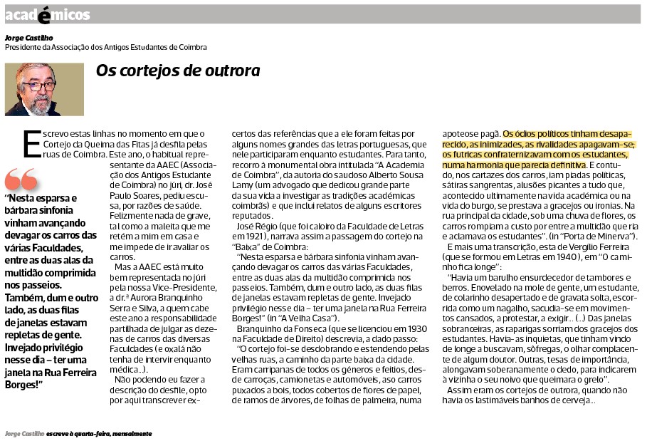 Escrevo estas linhas no momento em que o Cortejo da Queima das Fitas já desfila pelas ruas de Coimbra. Este ano, o habitual representante da AAEC (Associação dos Antigos Estudante de Coimbra) no júri, dr. José Paulo Soares, pediu escusa, por razões de saúde. Felizmente nada de grave, tal como a maleita que me retém a mim em casa e me impede de ir avaliar os carros.