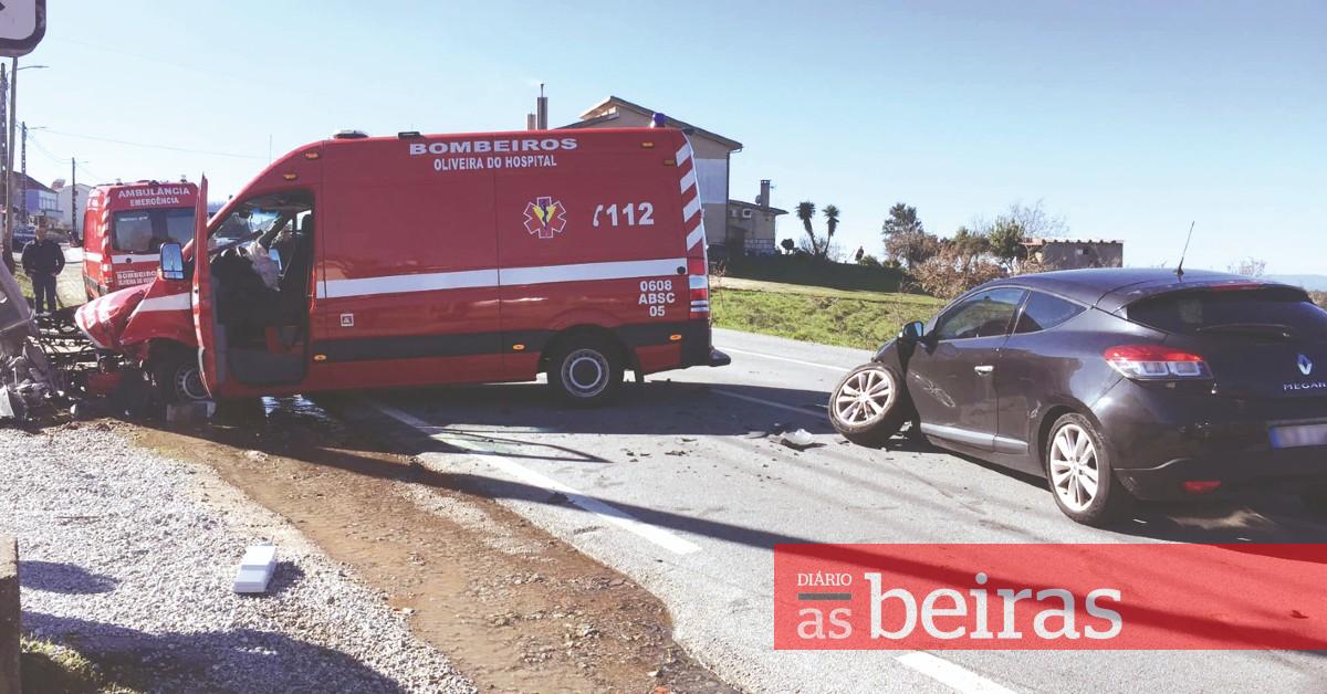 Dois homens e uma mulher ficaram ontem feridos, na sequência de uma colisão, seguida de despiste, que envolveu uma viatura ligeira de passageiros e uma ambulância dos Bombeiros Voluntários de Oliveira do Hospital (BVOH).